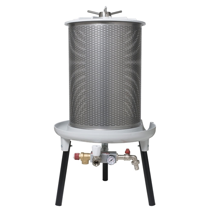 PEW40 leveres med lerretsduk for filtrering av mosten uten tilstopping, og søl samles enkelt opp i den medfølgende posen. Selve pressen er laget i rustfritt stål, med solid lokk og base i aluminium. En integrert sikkerhetsventil sørger for at trykket aldri overstiger 3 bar.