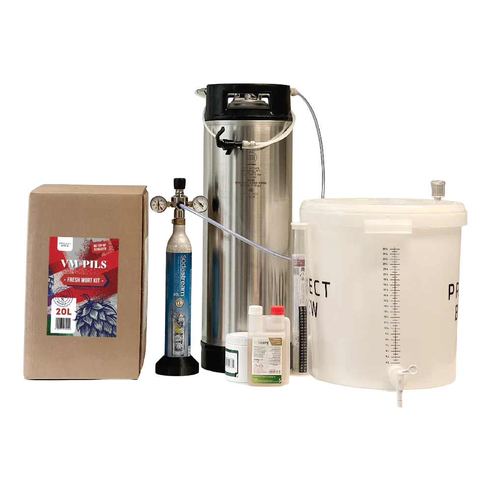 Startpakke for hjemmebrygging med VM Pils 20L Fresh Wort Kit og komplett utstyr for gjæring og karbonering på fat.