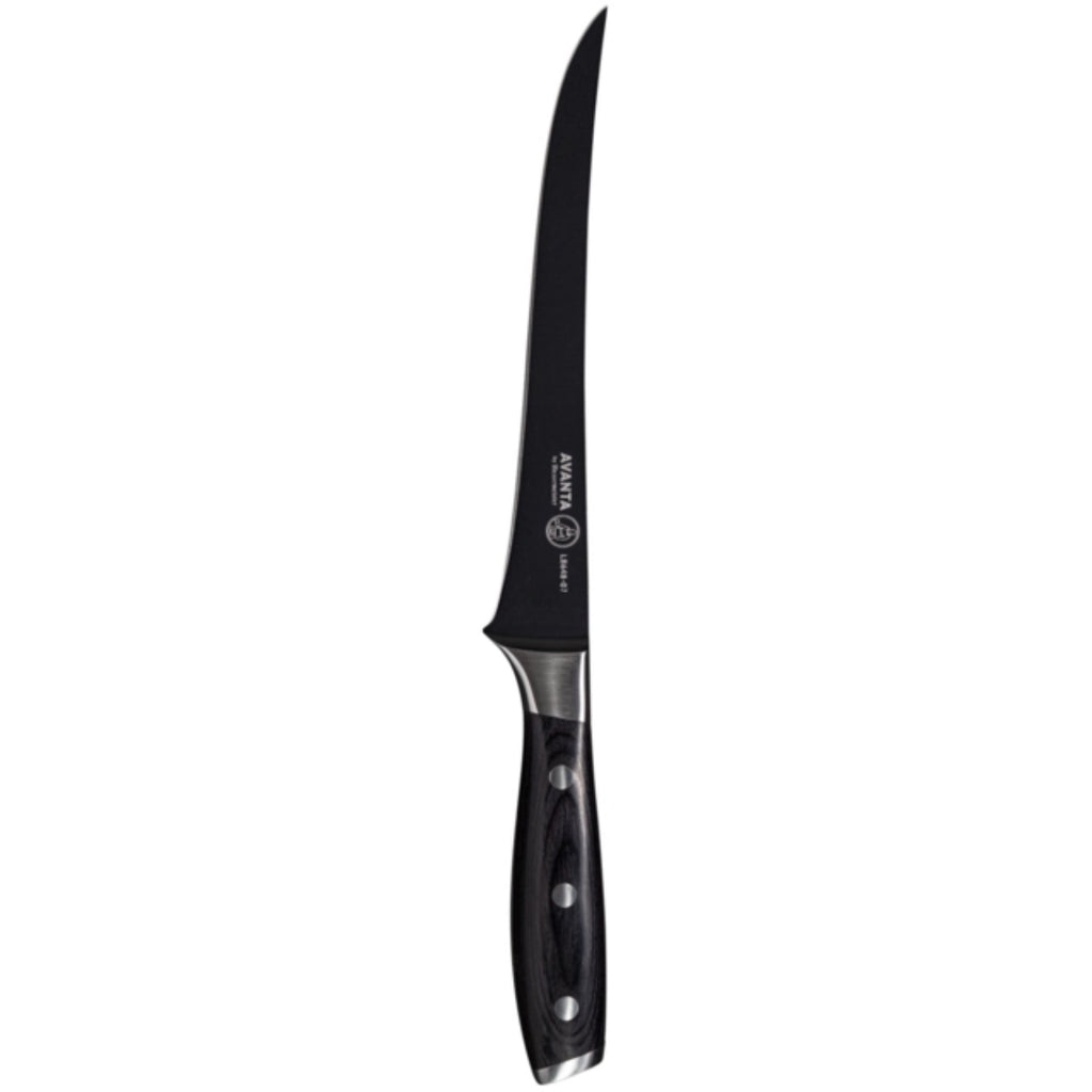 Den fleksible, avsmalnende bladformen gjør den ideell for å filetere fisk, trimme kjøtt eller fjerne bein med kirurgisk presisjon. Kniven har fulltange konstruksjon og pakkawood-håndtak i ibenholtfarge, som gir en perfekt balanse mellom tyngde, komfort og kontroll.