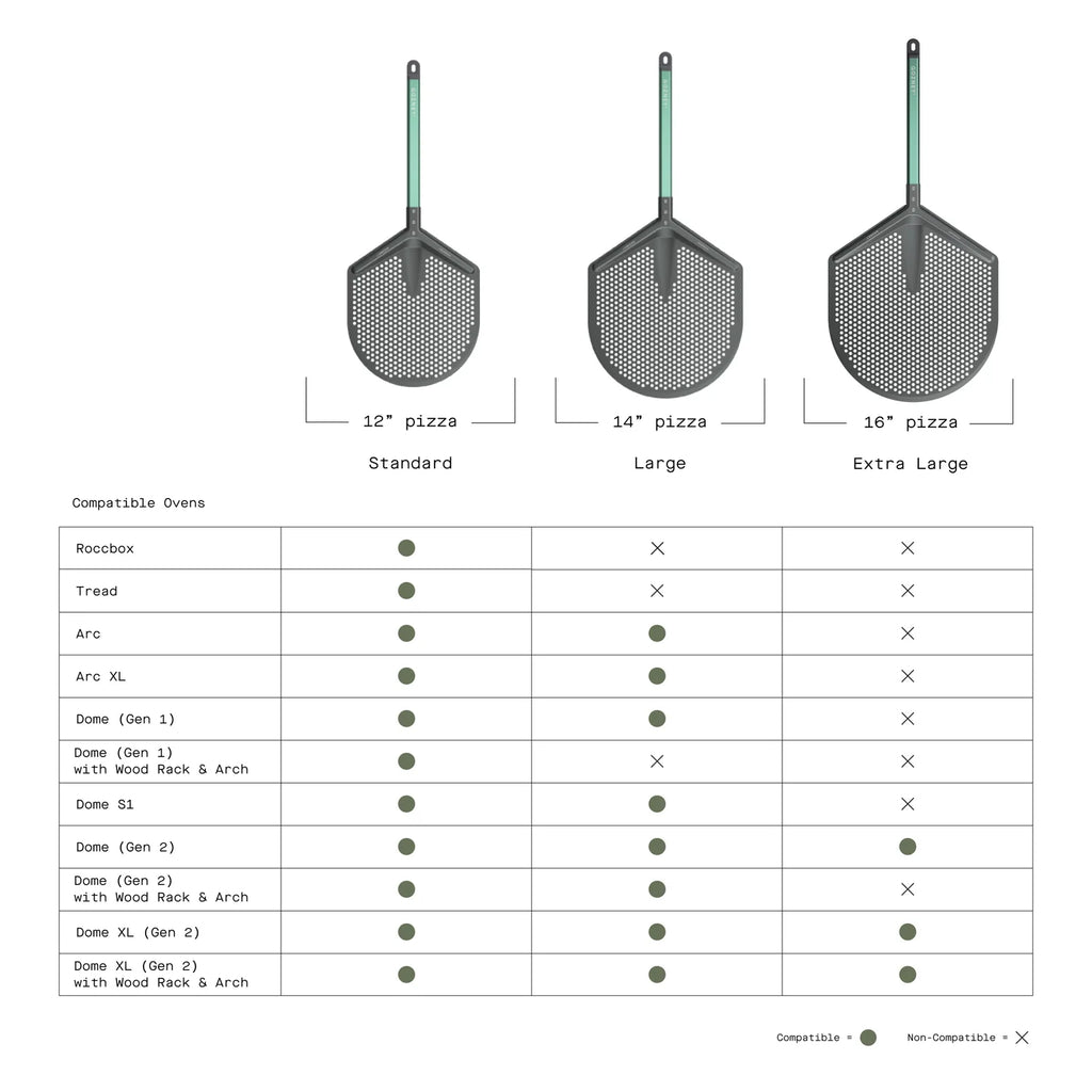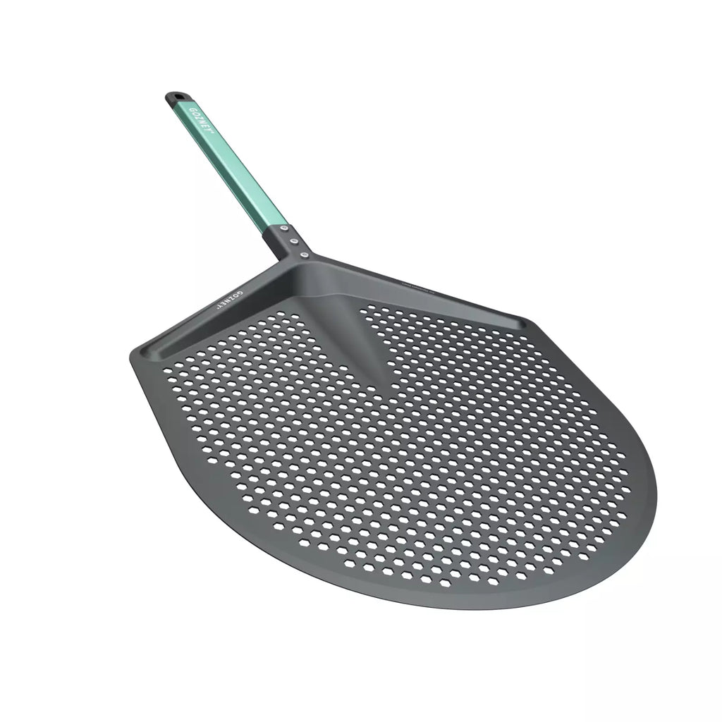 Det perforerte runde bladet slipper gjennom overflødig mel og hindrer brent smak under steking, samtidig som formen hjelper deg å forme en perfekt rund pizza hver gang. Det fasetthøvlede håndtaket i aluminium har skrå sider for et trygt grep og en buet underside som gjør at spaden glir sømløst i hånden når du skyver pizzaen inn i ovnen.
