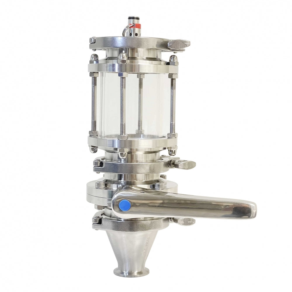 En hop dropper er en smart løsning for å kunne tilsette humle og andre ingredienser i gjæringstanken uten at innholdet eksponeres for oksygen. Leveres med overgang fra 3" til 1,5" tri-clamp, og passer derfor tanker med både 3" og 1,5" tri-clamp tilkobling.