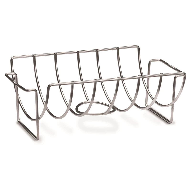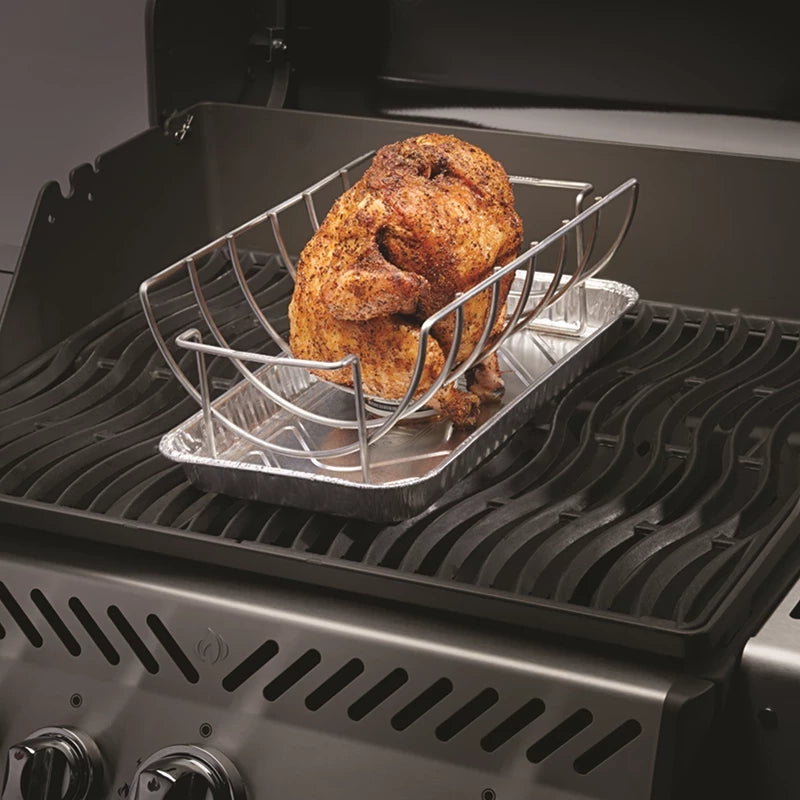 Denne vendbare stek- og ribsholderen er et uunnværlig hjelpemiddel når du skal grille større kjøttstykker, hel kylling eller spareribs. Bruk den som stekholder ved å legge steken i kurven og plassere et dryppbrett under. Da sirkulerer varmen rundt hele kjøttet, samtidig som kjøttsaften samles opp.