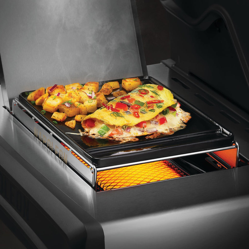 Med Napoleons stekeplate til liten SIZZLE ZONE™ får du maksimal utnyttelse av den infrarøde sidebrenneren på grillen din. Stekeplaten gjør det enkelt å lage bacon, stekte kamskjell, amerikanske pannekaker, sprøstekte poteter og andre retter som ellers er vanskelige å tilberede på grillrist.