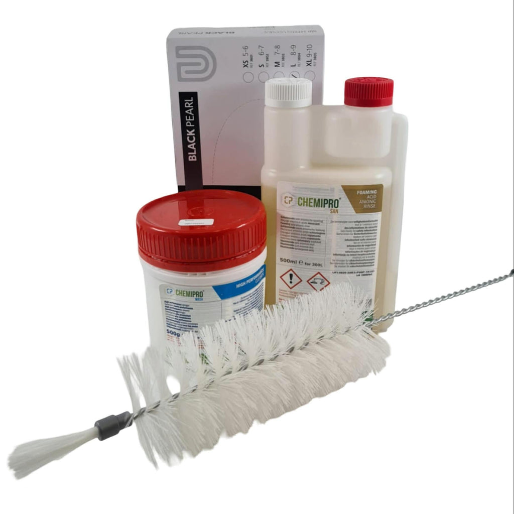 Med Chemipro Wash får du et effektivt rengjøringsmiddel som fjerner smuss og rester etter brygging, mens Chemipro San gir en rask og enkel desinfisering uten behov for skylling. Nitril engangshansker beskytter både hender og øl mot urenheter hendene, og flaskebørsten i nylon gjør det enkelt å rengjøre flasker i dybden.