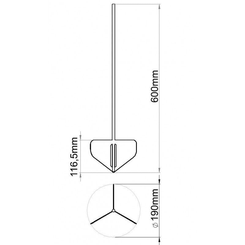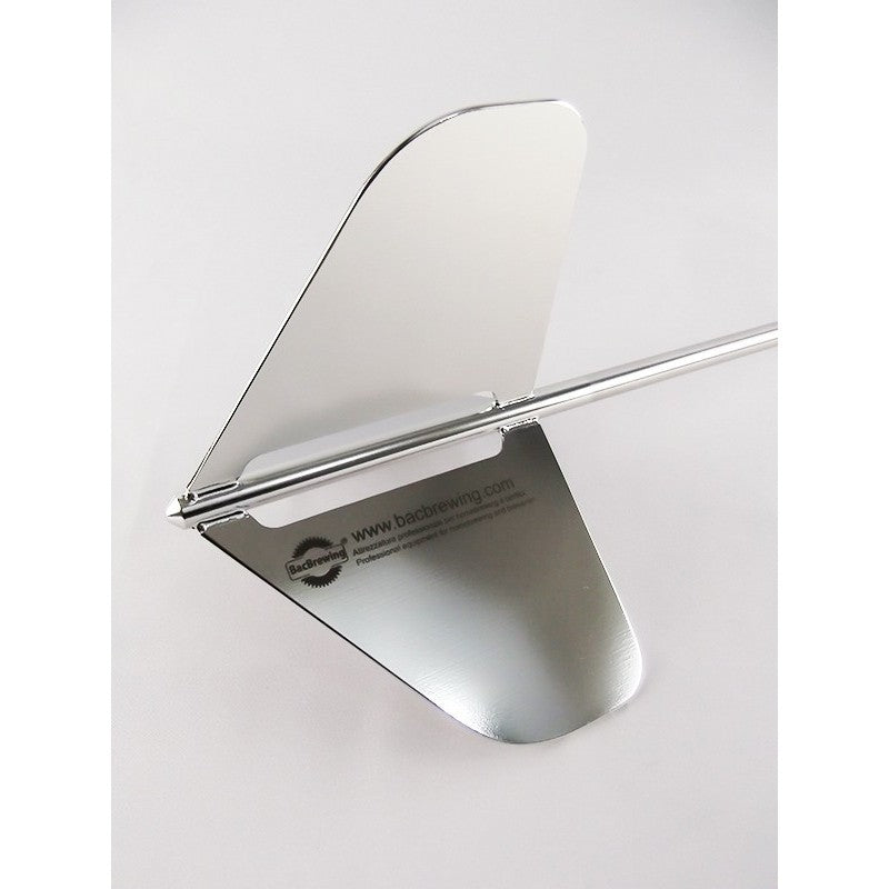 The shaft Length 60 cm is 10 mm diameter in stainless steel AISI304 full, the 3 pallets are thickness 20/10 are 9cm wide in Inox AISI 304 welded to the shaft at 120 ° between them with a particular shape that does not disturb the bottom and does not cause splashing in the extraction phase. Thanks to the fact that the pallets are three and not two, the whole is balanced, facilitating also the maintenance in the centre of the pot.