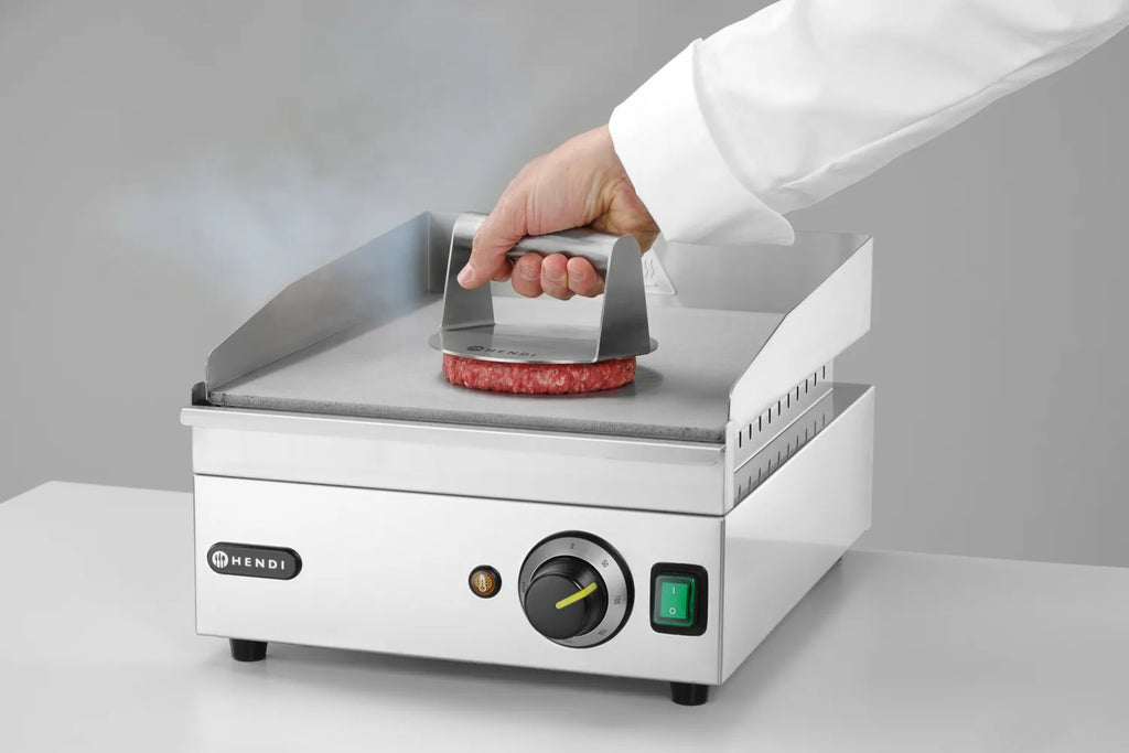 HENDI Smash burger press gjør det enkelt å lage jevnt formede burgere med optimal tykkelse og stekeflate. Pressen er produsert i solid rustfritt stål 304, et materiale kjent for høy korrosjonsbestandighet, hygieniske egenskaper og lang levetid. Dette gjør den ideell både for profesjonelle kjøkken og for hjemmekokker som ønsker restaurantkvalitet på burgerne. Diameter på pressen er 16 cm.