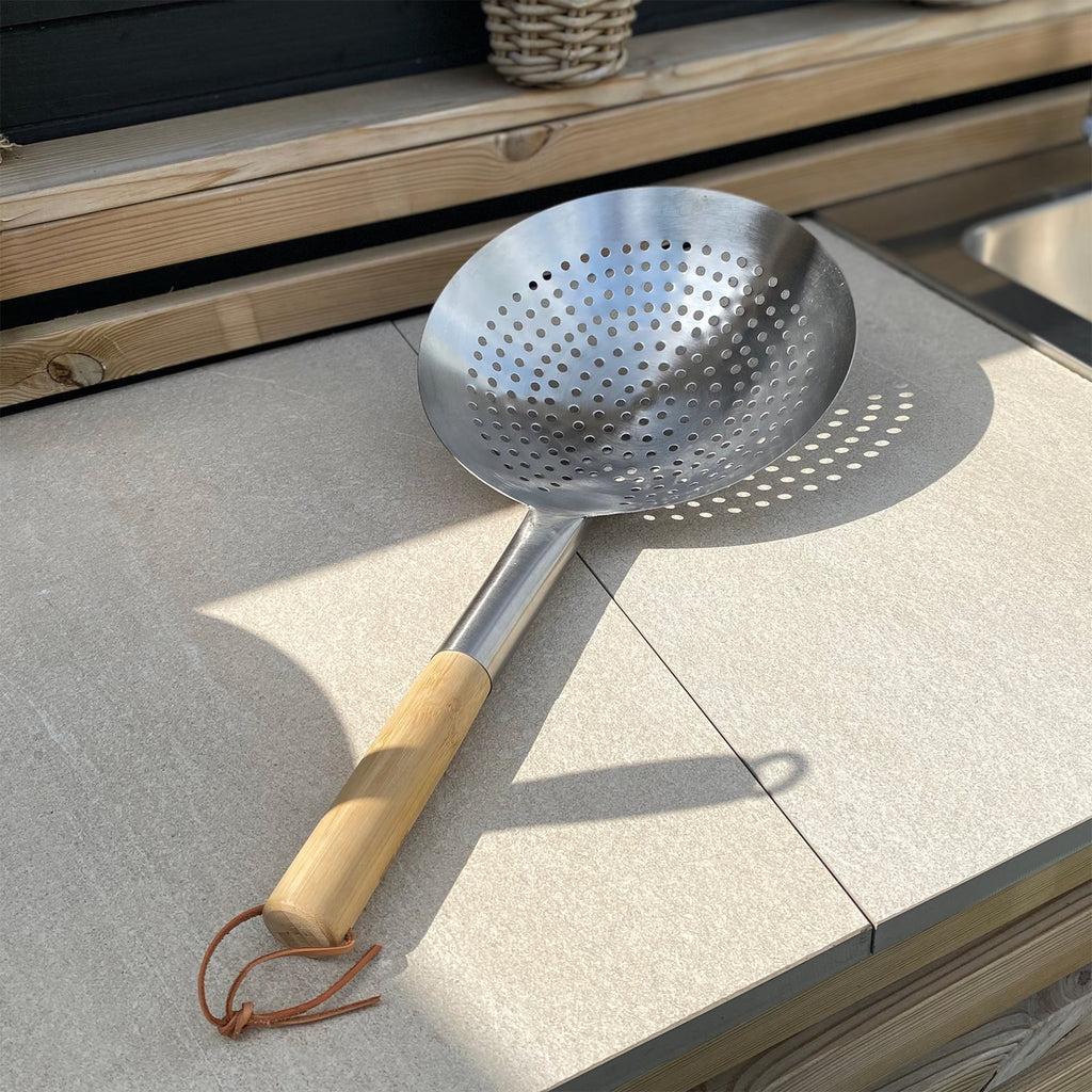 Hullskjeen, også kalt woksil, er laget i rustfritt stål som tåler høy varme og gir lang levetid. Det ergonomiske håndtaket i bambus ligger godt i hånden og gir et behagelig, sikkert grep under matlaging. Med den praktiske lærstroppen i enden kan du enkelt henge den opp, for eksempel på et HOT WOK Comfort-bord, slik at den alltid er innen rekkevidde når du trenger den. Et perfekt redskap for deg som vil ha profesjonell presisjon når du lager wok, frityrretter, supper eller gryter.
