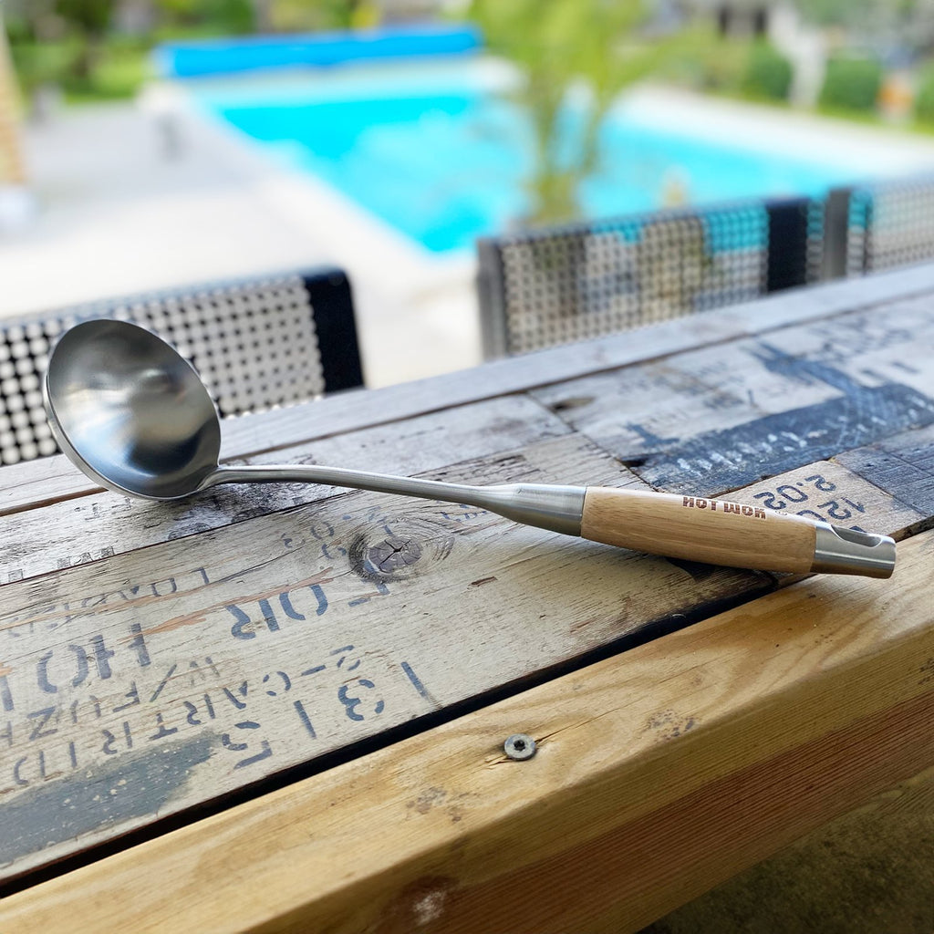 Øsen er laget i rustfritt stål, som tåler varme og gir maksimal holdbarhet, mens bambushåndtaket ligger behagelig i hånden og sørger for et sikkert grep, selv når tempoet øker. Den er perfekt til å øse ferdig mat over på tallerken, tilsette vann eller olje under tilberedning, eller fordele ingredienser jevnt i woken.
